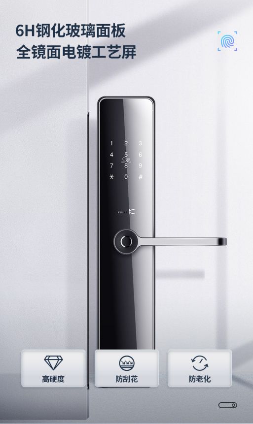 一握開智能鎖K31,延續(xù)一握開設(shè)計(jì),保持一步開門的快捷體驗(yàn),同時(shí)為K31智能鎖搭配了一整塊無拼接全鏡面電鍍鋼化玻璃屏,簡潔設(shè)計(jì)的高級感迎面而來,而這一整塊的玻璃屏并不僅僅為了好看,在選材上使用了6H硬度的鋼化玻璃,能抗電鉆等尖硬物的摩擦撞擊,安全性能大大提升。