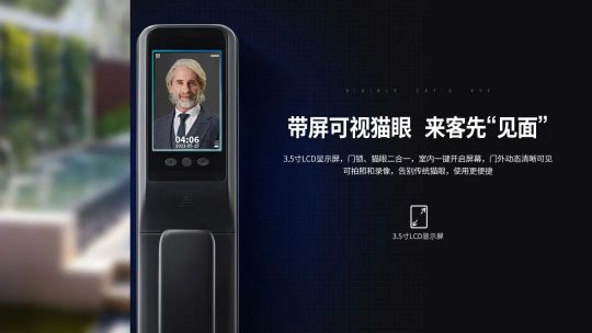 3.5寸LCD高清真彩顯示屏,大廣角攝像頭,層次鮮明,屏幕清晰可見。即使老人孩子獨自在家,客人來了或門外有異響,只需一鍵開啟屏幕即可輕松查看門外狀況,還能拍照和錄像,告別傳統貓眼夠不著、看不清的情況,居家安全更有保障。