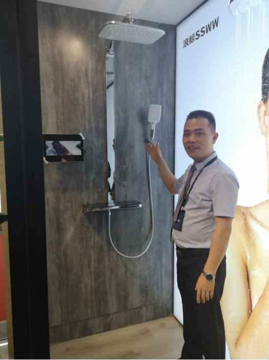 浪鯨潔具品牌中心總監林學舟在介紹明星單品大瀑布X10水療花灑
