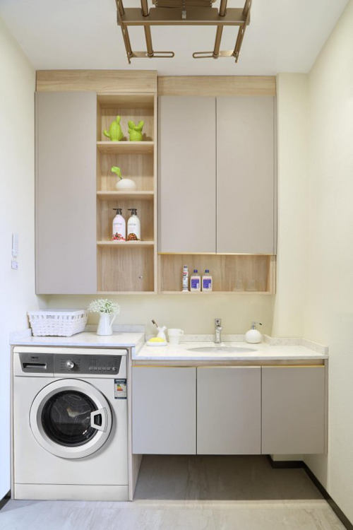 此外,箭牌定制衛浴-塞納時光具有完整的洗滌、擺放物品和洗衣功能,雖然布局新穎,但也充分利用了空間。白色的木紋與金色的防火板搭配,乍一看,充滿了和諧與自然的感覺。飛影灰雪的桌面給整個空間增添了一絲柔和。