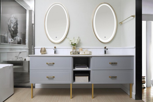 金色貝殼手柄、鋁合金柜腳和金屬覆蓋的LED燈鏡,讓箭牌定制衛浴-香榭打造出輕盈奢華的風格,優雅時尚,低調奢華,仿佛被困在繁華的外國街道上?;疑T板和簡單的線條設計在藍色、灰色和金色中相互呼應,但中和了經典的美國氛圍,創造了融合空間。