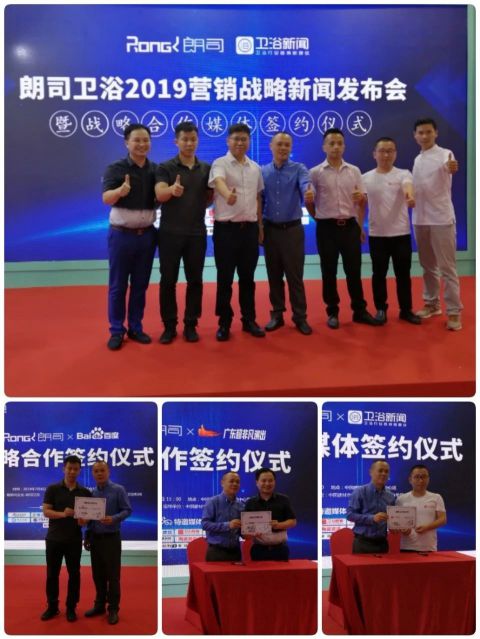 7月8日-11日,格朗司企業旗下品牌朗司衛浴,攜多款新品亮相2019廣州建博會,并于8日下午在衛浴館多媒體區,成功舉辦了2019營銷戰略新聞發布會暨戰略合作媒體簽約儀式。這些戰略媒體包括百度、央視、衛浴新聞、抖音等,朗司衛浴也由此成為展會期間最耀眼的明星。