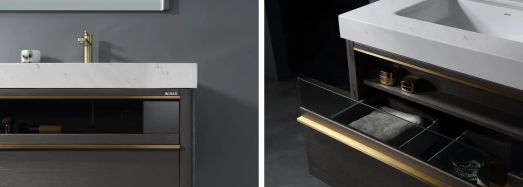 瑝瑪衛浴塵世系列屬于落地式浴室柜,底部懸空,既可以放各種尺寸的水盆,也很好地避免了水汽浸入底部,同時更方便清理和打掃。