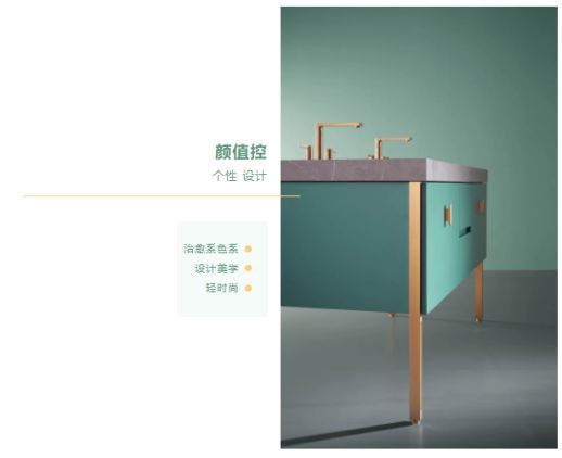 瑝瑪衛浴蒂依系列,顏值主義當道,以現代審美需求為基本,基于年輕人鐘愛的款式,運用高級感的香檳綠色糅合其中,讓衛浴間裝出“精致時尚感!既突顯了檔次和時尚,又反映了衛浴行業屬性和時尚的特色,契合了當下主流消費群體80、90后的審美習慣。