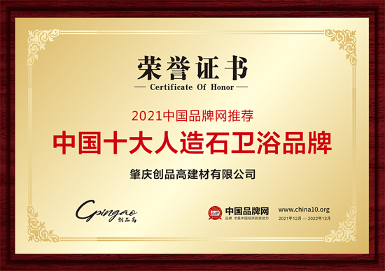 經過層層審核、激烈競爭,創品高衛浴品牌憑借優質的產品、完善的服務、良好的口碑,在一眾知名品牌中脫穎而出,一舉榮獲2項全國性品牌殊榮——“中國十大衛浴品牌”、“中國十大人造石衛浴品牌”兩大稱號,彰顯出創品高在業界的實力和地位!