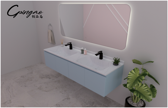 經過多年探索,創品高自主研發出新一代人造石——綺美石,它具有無縫拼接、熱彎性強、顏色種類豐富、造型多樣多變、環保綠色等優點。以綺美石為原材料打造的浴室柜,表面光滑,手感細膩,質感高級,極簡設計更襯托出浴室的高端、主人家的品味。