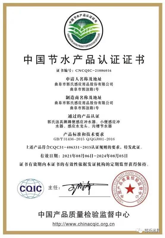 2021年8月,郭氏潔具產(chǎn)品獲得《中國節(jié)水產(chǎn)品認(rèn)證證書》。