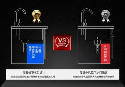 悍高手工水槽采用后孔排水設計,使排水管更加靠里面,水槽下方櫥柜可以擁有更大的收納空間。
