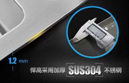 目前市面上的廚房水槽主要有不銹鋼、亞克力、人造石材廚盆、陶瓷廚盆及鑄鐵幾種材料,其中不銹鋼水槽產品款式最多、型號最多。單就不銹鋼水槽來說,也有具體型號材料的差別,根據鋼種含錳、鎳、鉻等元素的差異,其耐腐蝕性、硬度、韌性等都有差異。據廚房設計師介紹,“最好的制造水槽的鋼板是304鋼板。這種鋼板無論硬度與耐磨性都是最適合廚房使用的。鋼表面特別光滑,不掛油,不掛污垢,根本不用刷鍋球清潔,用抹布就足夠了。” 一般拉伸工藝制作的水槽,不銹鋼厚度在0.8mm以下,而悍高廚房手工水槽采用加厚SUS304不銹鋼,厚度達1.2mm-1.5mm,用材健康可靠,使用壽命更長。