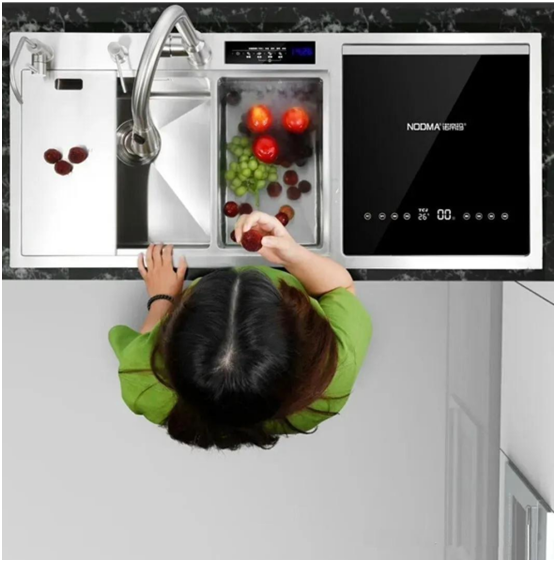 諾帝瑪雙觸媒果蔬智能凈化水槽,采用高端SUS304不銹鋼,純手工打造;3.5MM超厚面板,1.2MM超厚槽體,打造金剛不壞之身;精細R10弧線打磨,更易打理;內置隱藏刀架,刀具嵌入擺放更省心;多種款式、大小面板可選,滿足不同廚房需求。