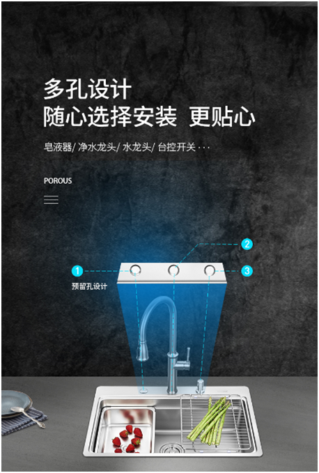 新產(chǎn)品雖是單槽,但克服了單槽的缺點(diǎn),同時(shí)通過(guò)創(chuàng)新組合搭配發(fā)揮出單槽和雙槽的最大優(yōu)勢(shì)。三大容量設(shè)計(jì)——盆中盆+瀝水籃+瀝水架,不僅最大效率利用廚房空間,而且滿足收納,廚房整潔干凈,消費(fèi)者能夠獲得舒適愉悅的廚房體驗(yàn)。能夠左右移動(dòng)的雙臺(tái)階設(shè)計(jì),體現(xiàn)諾帝瑪對(duì)用戶行為的觀察,雙臺(tái)階設(shè)計(jì)方便用戶的廚房行為,隨手放,隨手用,最大限度的節(jié)省空間。