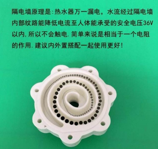 如果大家拆開過電熱水器的防電墻,看防電墻里面的內部結構的話。就會發現它是在內部做成一個個的環形水路,把水引到這個環形內部來增加水的傳輸的距離,以此來增加水本身的電阻。降低水中的電流,以此來實現一個防止漏電觸電的事故。