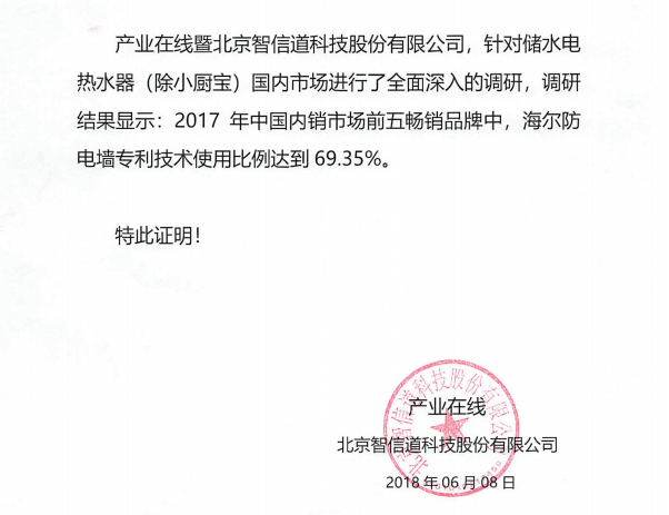 安全是電熱水器用戶最擔心的問題。最近,有業內人士對國內市場進行了深入調查,調查結果顯示,2017年,在中國國內市場五大暢銷品牌中,電熱水器十大品牌海爾的防電墻專利技術使用比例達到69.35%,這意味著市場上近70%的暢銷品牌都使用了海爾的專利防電墻。