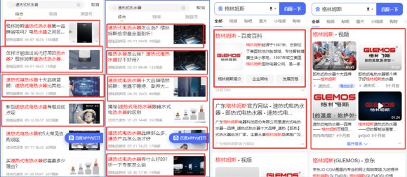 用戶在百度搜索“速熱式電熱水器第一品牌”、“速熱式電熱水器十大品牌”、“速熱式電熱水器什么品牌好”等行業高度熱門詞時,格林姆斯的相關資訊都會出現在搜索首頁,實現行業的精準滲透,充分展現出品牌的實力和地位,讓格林姆斯高端品牌的觀念深深植入到消費者腦海中。