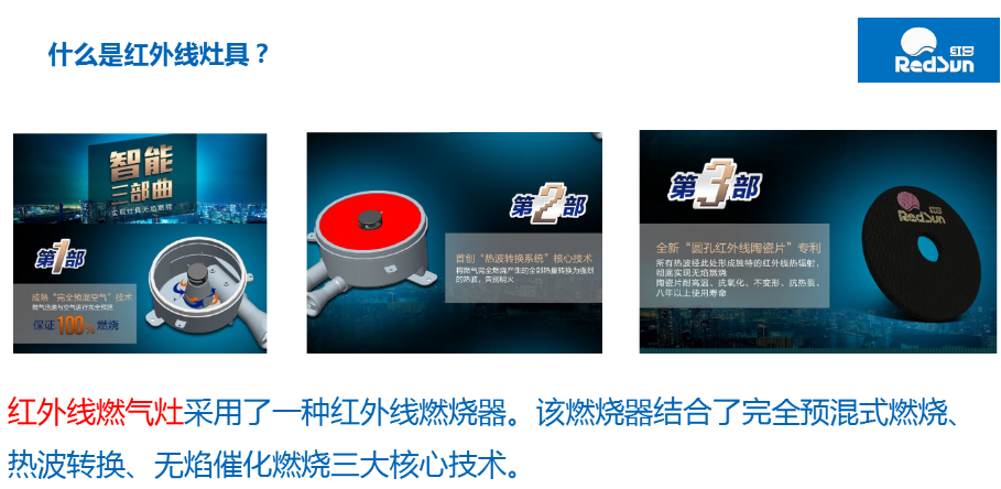 紅日應用“高紅外發射率多孔陶瓷節能燃燒器技術”生產的紅外線多孔陶瓷節能灶具具備“高效節能、環保健康、潔凈衛生、安全可靠”的顯著特點,節能20-40%,是一種低碳環保節能的產品,產品經中國質量認證中心認定為“中國節能認證產品”、“中國環保認證產品”;、經廣東省科技廳認定為“廣東省自主創新產品”、“廣東省高新技術產品”、“廣東省重點新產品”。紅日國內擁有近5000個終端銷售網點和1000多個售后服務網點,遍及我國除西藏、臺灣外的其他二十多個省、市、自治區,紅日紅外線多孔陶瓷節能灶具擁有許許多多忠誠的用戶。