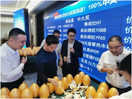 亮點滿滿的優惠政策一經公布,再次將現場的熱烈氣氛推向新高度。透過經銷商發自內心的肯定與滿臉的喜悅之情,我們能看出眾人心中已經有了要下單訂貨的強烈欲望,這也正為接下來的下單打款環節奠定下基礎。而為感恩各位經銷商的下單支持,銀田還特意準備了砸金蛋環節,將集成灶、煙機、熱水器等豪華大禮傾情相送。