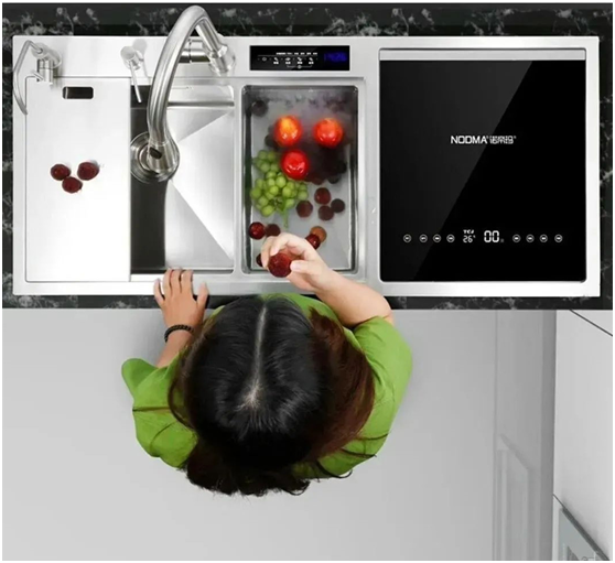 諾帝瑪雙觸媒果蔬智能凈化水槽便是其中的一款。諾帝瑪將“羥基水裂解凈化”技術融入產品打造,結合不銹鋼水槽集成一體,設計出一款新型功能健康廚房產品。它不但具有普通廚房水槽的所有功能,同時又具有“羥基水裂解凈化技術”的相關優點,可以快速地實現去農殘、殺病毒、降激素、保營養的優勢,且在安裝和使用上也簡易方便。此次諾帝瑪推出的雙觸媒果蔬智能凈化水槽,正是通過技術升級和產品創新得出的全新成果。