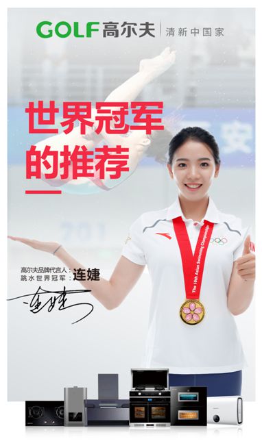 專業、刻苦專研、嚴格要求一直以來都是運動健兒的正能量形象代名詞,連婕女士作為優秀的運動員及跳水世界冠軍,曾在各大比賽中多次獲得冠軍榮譽,并在北京體育大學進行深造,不斷挑戰自我,將體育精神發揮得淋漓盡致,與高爾夫廚電品牌一直以來遵從的專業專注、創新共贏的企業精神不謀而合,強強聯手,如虎添翼!