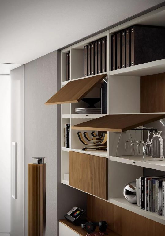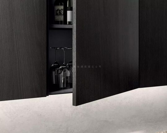 低調、簡單,以不失質感的柜體給人帶來高貴寧靜的視覺感受。柜面的中性色系,面板紋理線條簡潔,白墻背景,奠定了空間低調的質感、優雅的基調,巧妙搭配自然質感的石材以及金屬元素,賦予空間生動輕靈的魅力。