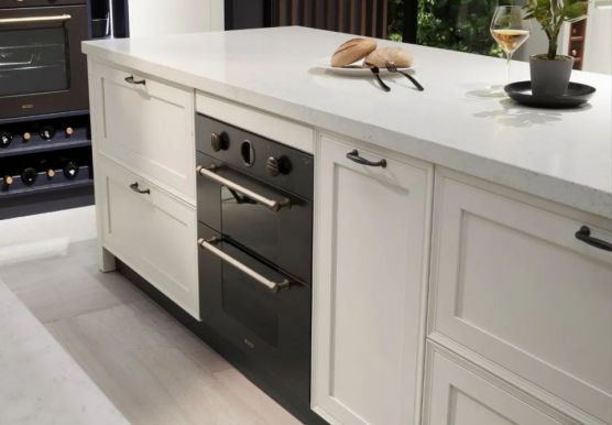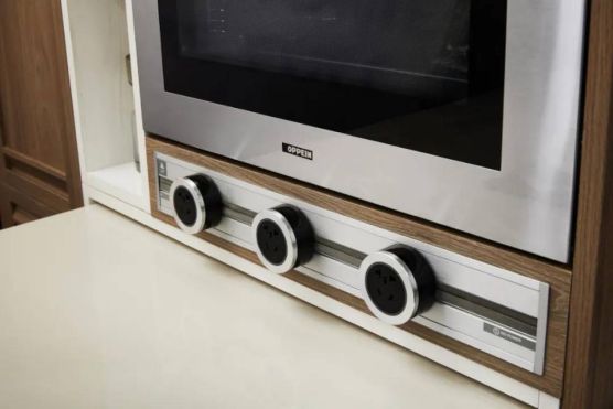 所以,大件電器如烤箱、洗碗機等盡量嵌入柜體?;蛘咴O計一個電器柜,把常用的電器集中收納起來,形成一個電器區。這樣在一個位置就能找到你要使用的多個電器,方便又高效。
