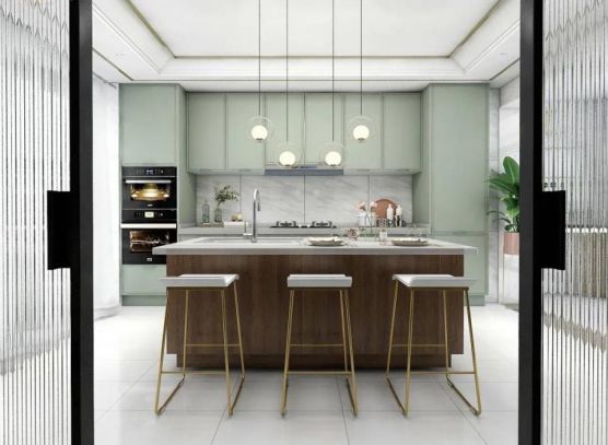 對輕奢風感興趣的朋友,小歐推薦這款灰綠色的整體櫥柜,島臺上一盞高顏值的吊燈,整個廚房的品位都上了一個檔次。