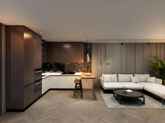 侘寂風推薦霧灰、米褐、砂巖色;性冷淡風可選純黑、冷白、金屬灰,通過材質肌理(如不銹鋼拉絲、微水泥顆粒)增加層次感。