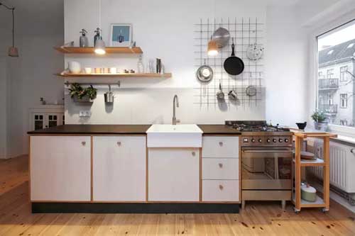 格子網架非常好用。在空間不大的小廚房里,這樣的網架能掛在墻上,有效率收納你的廚具和五金,而且還讓你的廚房有了與眾不同的手工風格。這個案例里在一旁也盯上了層板,相輔相成又簡潔。不過要注意的是,這么顯而易見的收納方式,一定要把東西掛得整整齊齊才不雜亂。