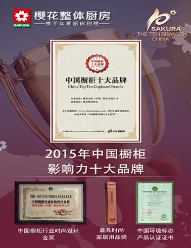 2015年9月1日由中國櫥柜網主辦,新浪家居、鳳凰網、搜狐家居、央視網等數十家國內綜合媒體鼎力支持的2015“中國櫥柜十大品牌”評選活動落下帷幕,在此次投票活動中,櫻花整體廚房榮獲 “中國櫥柜十大品牌”稱號。這是櫻花整體廚房連續兩年獲得“十大品牌”的稱號,這是廣大消費者的評價和信任。