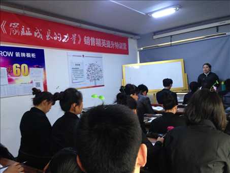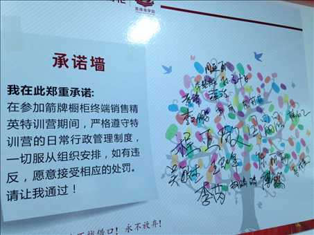 來到箭牌櫥柜本次北京區(qū)域集訓(xùn)的場地,一進(jìn)培訓(xùn)教室就赫然看見每位同學(xué)都頭戴豆芽,萌態(tài)十足。在教室左邊還粘貼著一張制作精美宣誓背景墻,墻面背景是一棵茁壯的大樹,上面密密麻麻寫著學(xué)員的名字,綠意清新、創(chuàng)意十足。