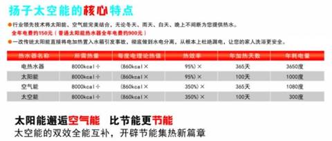 此外,揚子太空能熱水器因是“太陽能+空氣能”雙能全效互補,節能性比第二、第三、第四代產品都要省電。測試顯示,制造相同熱水量,一年內,電熱水器耗電3650度,太陽能熱水器耗電1000度,空氣能熱水器耗電1080度,而揚子太空能熱水僅需300度電。