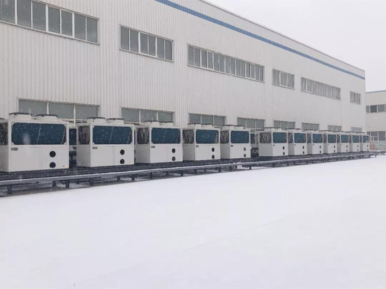 該項目是彩鋼板廠房,廠房高9米,分為辦公室區域(兩層,每層高3.5米)和生產車間區域,供暖總面積13000㎡。歐思丹空氣能根據本項目建筑結構特點,綜合考慮建筑熱負荷以及包頭市-23℃(歷史極端天氣)的惡劣環境工況,選用28臺歐思丹30匹超低溫空氣能熱泵機組保障冬季供暖需求,辦公室末端采用地暖,生產車間末端采用風機盤管。