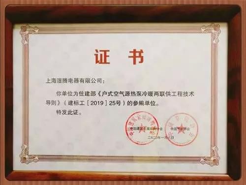 2020年1月8日,下午,住建部《戶式空氣源熱泵冷暖兩聯供工程技術導則》初稿討論會,在廣東順德順利召開。濕騰電器作為優秀企業代表,受邀參加了本次會議,并在會上榮耀獲頒“參編單位”證書。