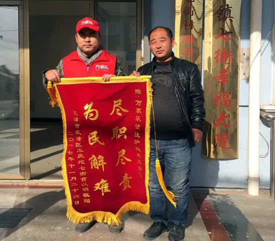 萬家樂的售后工程師逯苗苗得知情況后,雖然不是萬家樂的產品的問題,但他還是盡快趕到現場進行緊急維修。項目完成時,已經是凌晨兩點多了。任志彬回家后特別感動,他舉了一面旗幟表示感謝。