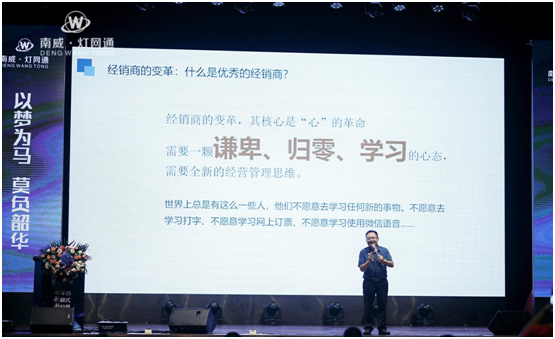 此時,舞臺主角切換至南威·燈網通的經銷商家人們。總部邀請出兩位優秀經銷商代表演講,他們分別是成都華潤燈飾總經理劉文瓊女士與贛州市彩虹名燈總經理曾昭斌先生。他們從經銷商合作伙伴、創業人士的自身視角,講述與南威·燈網通的合作歷程,分享經營終端門店的成功經驗與挫折教訓,為在場伙伴帶來了實用性啟發。