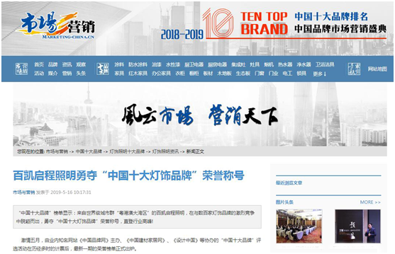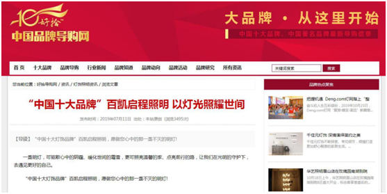 2019年,從《新浪》、《網易》、《搜狐》、《騰訊》等中國著名門戶網站,到《中國品牌網》、《中國品牌招商網》、《中國品牌導購網》等全行業知名媒體,再到《中國建材家居網》、《中國家居資訊網》等泛家居行業平臺,都曾對百凱啟程照明進行過采訪與報道,也皆對百凱啟程的發展給予了高度的評價。