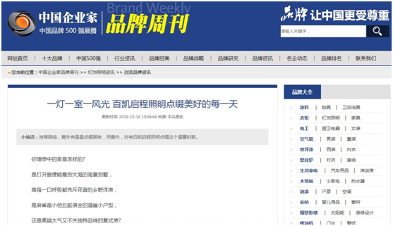 《中國企業家?品牌周刊》刊載報道:多年來,百凱啟程團隊始終站在消費者的角度看問題,并憑借敏銳的市場觸覺與成熟的設計水平致力于時尚產品的研發生產,接連不斷地向市場輸送別具一格的照明臻品。
