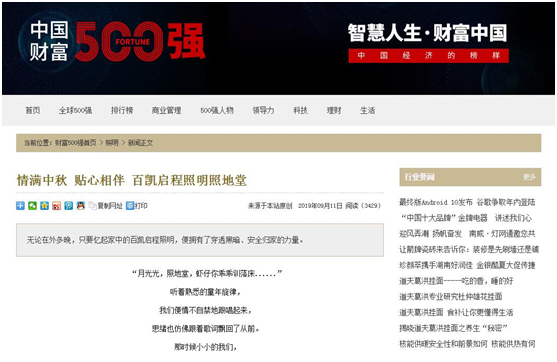 又如2019年中秋節,百凱啟程在《中國財富500強》上刊載對粉絲“愛的告白”:月光雖無法十二時辰照亮我們,但百凱啟程照明卻可時時刻刻守候在旁。不管白天,還是黑夜,只要你需要,百凱啟程便一直在!