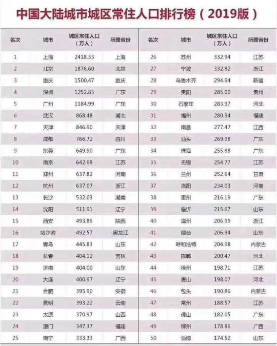 ▲中國大陸城市城區常住人口排行榜(2019版)