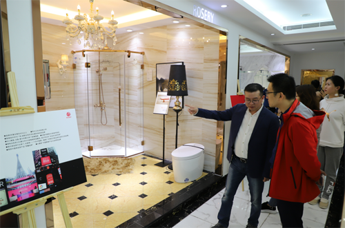 在展廳里,玫瑰島核心團隊向上海紅星美凱龍住建領導一行詳細地介紹了玫瑰島全衛定制六大產品矩陣之核心產品——安全+易潔二合一,人文與技術結合,自帶治愈焦慮的屬性,讓消費者洗得放心、洗得舒心、洗得省心的玫瑰島第四代淋浴房。