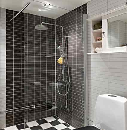 淋浴房裝修效果圖二:現(xiàn)代簡約衛(wèi)生間,整體空間以黑白色為主色調,黑白格的方磚,墻磚黑白分離把整體風格的簡約化,展示的淋漓盡致。