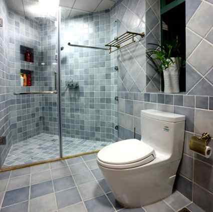 淋浴房裝修效果圖三:中式藍色衛(wèi)生間,整個空間主色調運用藍灰色的地磚,盆栽的擺放讓整個空間多了些許生機,設計以簡潔的線條來構成于一體的中式整體空間格局。