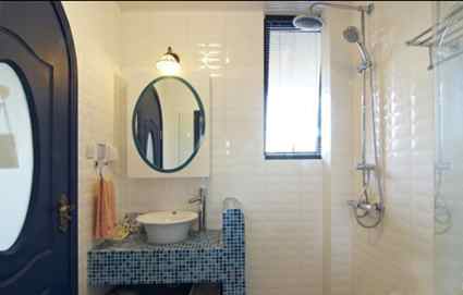淋浴房裝修效果圖四:地中海白藍色衛(wèi)生間,洗漱臺采用了地中海風格常見的馬賽克元素,與整體米白色墻面形成一個對比,整體空間沒有過多的裝飾品,讓空間看起來整潔大方。