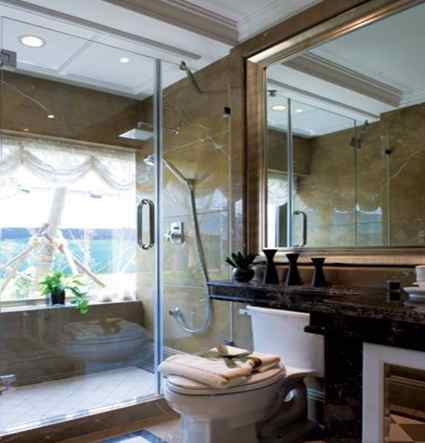 淋浴房裝修效果圖五:歐式咖啡衛(wèi)生間,洗漱臺運用了歐式壁爐的造型,簡約的石膏線吊頂,卻沒有歐式那種繁多裝飾,造型比較簡單,整體空間以咖啡色為主,飾以淺色來進行整體配色,讓人看著舒適簡潔。