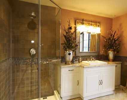 淋浴房裝修效果圖六:新古典黃色衛(wèi)生間,整體以白色和古銅色調為主,洗漱臺的造型簡潔,臺上的花瓶給整個空間多添了些古典韻味,古銅色的墻面讓人浮躁的心,瞬間平靜的下來,營造了一種安靜氛圍。