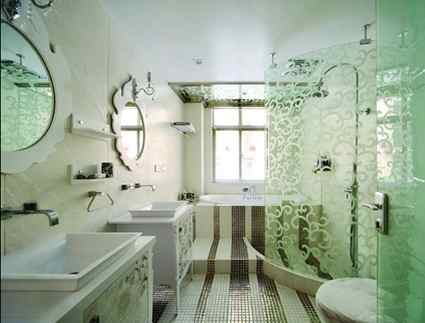 淋浴房裝修效果圖七:歐式綠色衛(wèi)生間,整體空間以綠色為主色調,再配以黑白色,墻面運用歐式常見元素銅藝壁燈,又增加了現(xiàn)代元素鏡子的融合,空間給人一種自然清新的感覺。