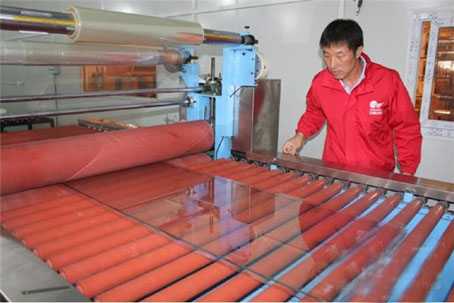 在東鵬潔具車間里,“淋浴房(屏風)自動化貼膜機”正在幾名技術人員的操作下執行著玻璃貼膜工作。一塊玻璃完成一個完整的貼膜工序首先要經過清潔機以及貼膜機轉軸的雙重清潔。接著在貼膜機的幫助下自動完成貼膜黏合。每完成一個步驟,都必須由技術人員進行質量檢驗保證貼膜的合格率。