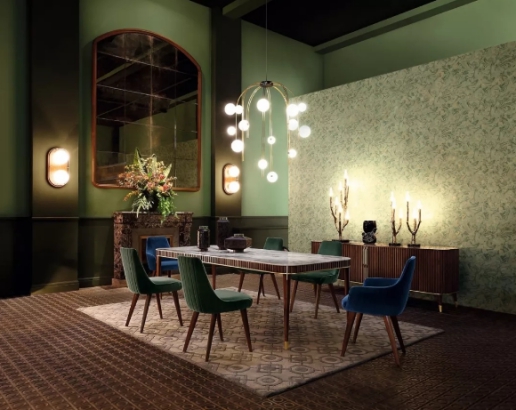 EDEN-ROCK是2019年度春夏主打的古典系列,垂直百葉移門部件挑戰了復雜的技術層面。大理石餐桌四周鑲有雕刻的木條和黃銅裝飾,疊加豪華感,配套的扶手椅使用春夏氣息的藍綠色絲絨面料,整個餐廳系列的設計極具年代感的肌理,仿佛在當下也能經歷著20世紀50年代的風情。