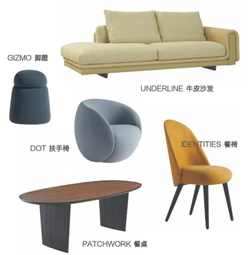 NATIV系列中的主角——UNDERLINE牛皮沙發,皮革色調帶有礦物和水泥的渾厚質感,特別之處在于仿佛覆蓋了一層羽絨被的外觀設計,給人踏實的懷抱。PATCHWORK餐桌用約320塊木板拼接而成,每件餐桌的木紋都不一樣。DOT扶手椅和GIZMO等一系列坐墩的設計充滿鮮活有機的能量…