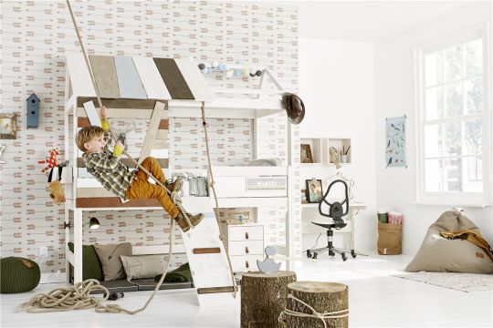 高或低兩種類型樹屋床可供大家自主選擇,可以滿足不同年齡段孩子,童趣盡藏匿在這一方天地之間。樹屋床意象中更是拓寬了孩子的整個想象維度,置身其中孩子視眼所及仿佛“折疊”出一眾草木盛林,奇艷紛爭處盡是妙趣橫生的萬般繽紛世界,不斷豐富著孩子對未知世界的無盡探尋求索欲。