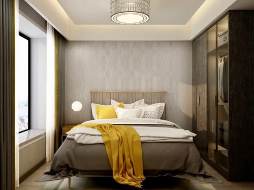 愜意的舒適感,從來沒有過多繁瑣的造型,灰白咖同樣可以營造溫馨舒適的居住氛圍,線條簡約的金屬床和玻璃柜面定制衣柜,讓整個空間通透、輕盈。黃色軟裝飾品的運用點亮整個空間。